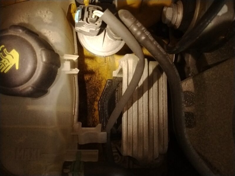 これは液封入式のエンジンマウントによくある事象で、内部の液状のシリコンが漏れ出している跡です。