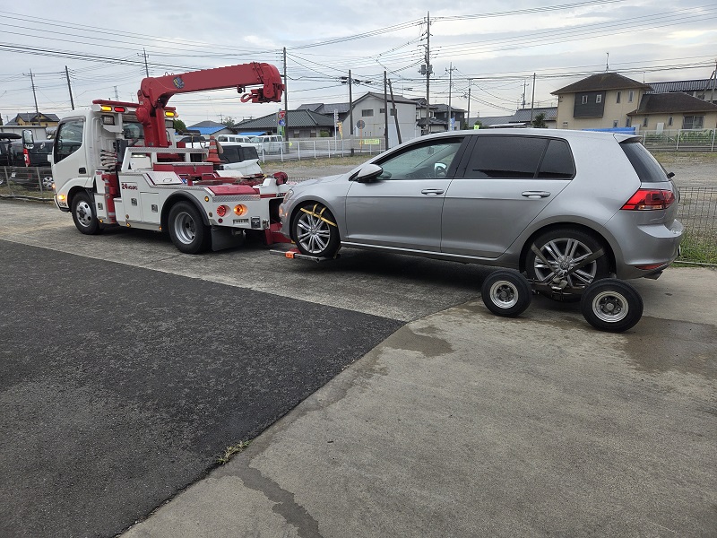 イグニッションキーが回らないことですので、エンジンが掛からないばかりかハンドルを切ることが出来ない、シフトはニュートラルにできない、電動パーキングが解除できない状態ですのでこのような状態での搬送になります。