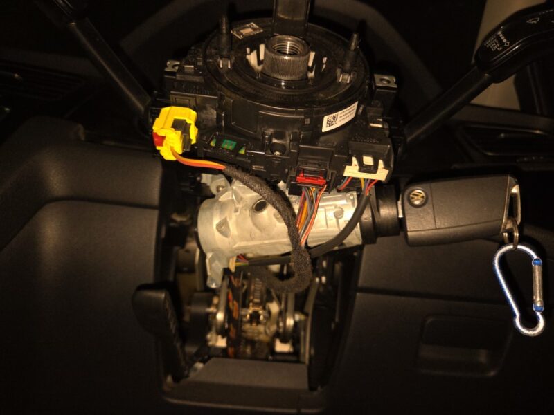 VW ゴルフ7    イグニッションキー回らないとの事で連絡が入りました。 イグニッションキーが回らないことですので、エンジンが掛からないばかりかハンドルを切ることが出来ない、シフトはニュートラルにできない、電動パーキングが解除できない状態ですのでこのような状態での搬送になります。 この故障に関してはゴルフ6のころからよく起きる事象で定番故障になります。 まずはロックユニットアッセンブリーで取り外します。 しかしキーが回らなくなった状態ではここからひと手間掛かります。 それはロックユニットからキ ...