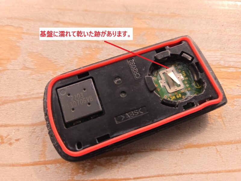 キーを点検すると電池は新しいはずなのにパイロットランプの点灯がなんとなく薄いですし、電池をどかして基盤を見ると何か濡れて乾いたような形跡が見られたのでキーの故障と判断して新しいものと交換します。