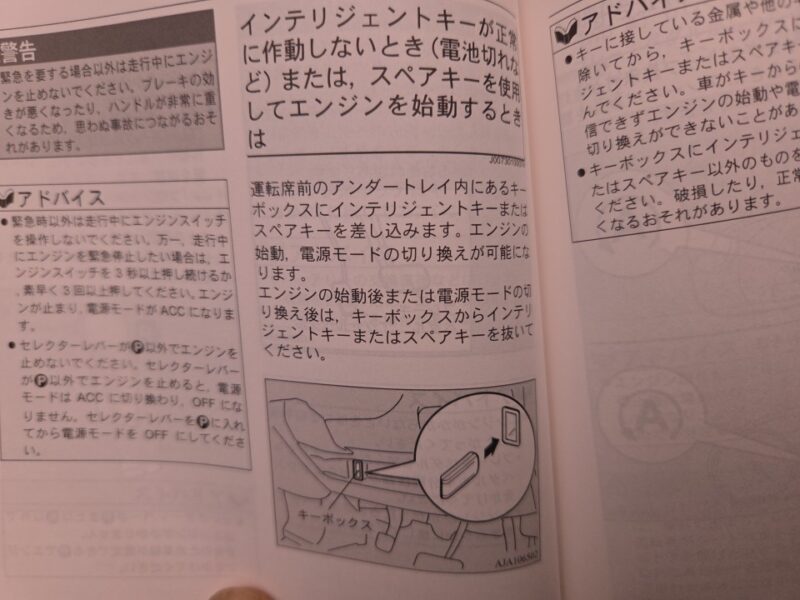 その緊急用ともいえるアンテナが一般的にはプッシュスタートボタンにあるのですが今回の車両では足元のスロット(キーボックス)だったわけで、取扱説明書を後々よく読んでみると確かに記載はありました。