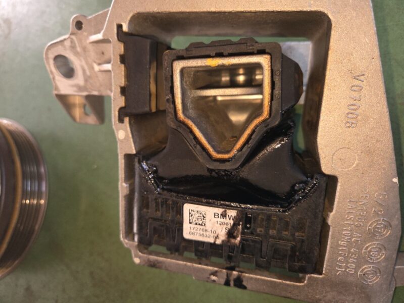 液封入タイプのエンジンマウントでイメージでは水風船でエンジンを支えているようなものでただのゴムだけのマウントよりも振動吸収性能は上なのですが風船が破裂するとこのような状態になってしまいます。