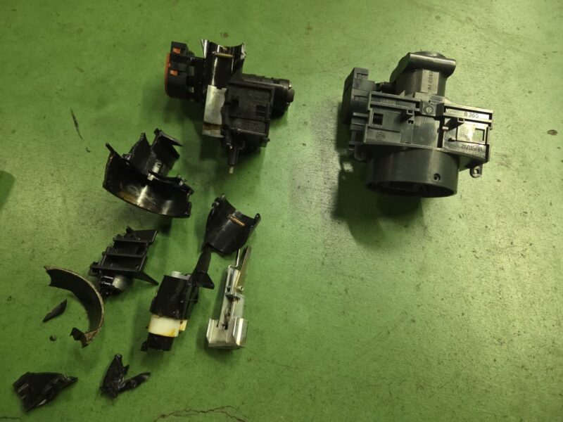 この部分はワイパースイッチ・ウインカースイッチ・イグニッションスイッチ・ハンドルロックを一体にする部品なのですが樹脂で出来ているため劣化で割れてしまったようです。